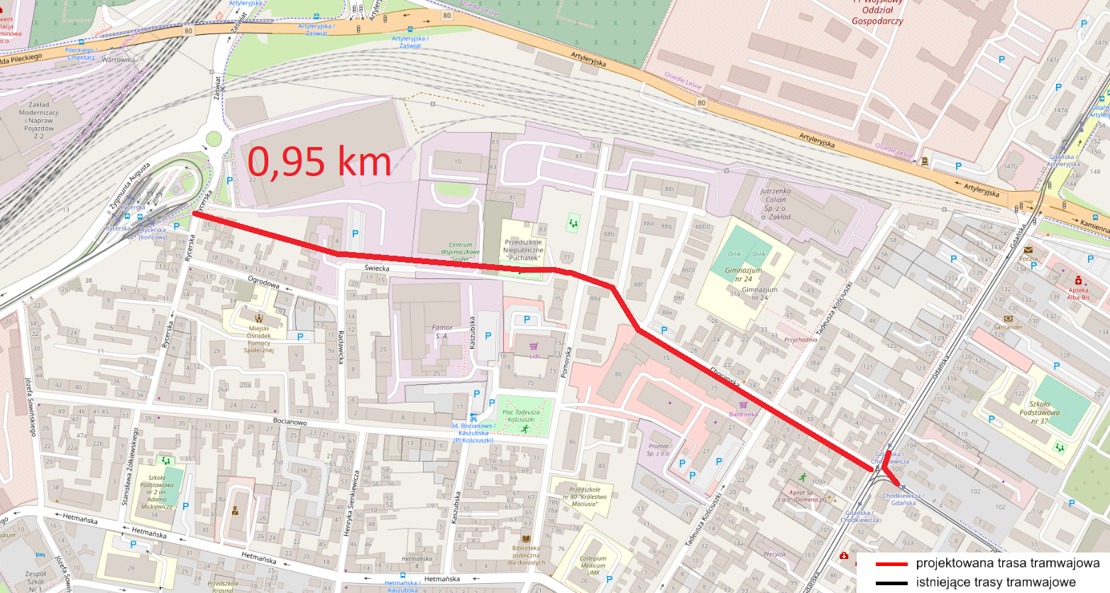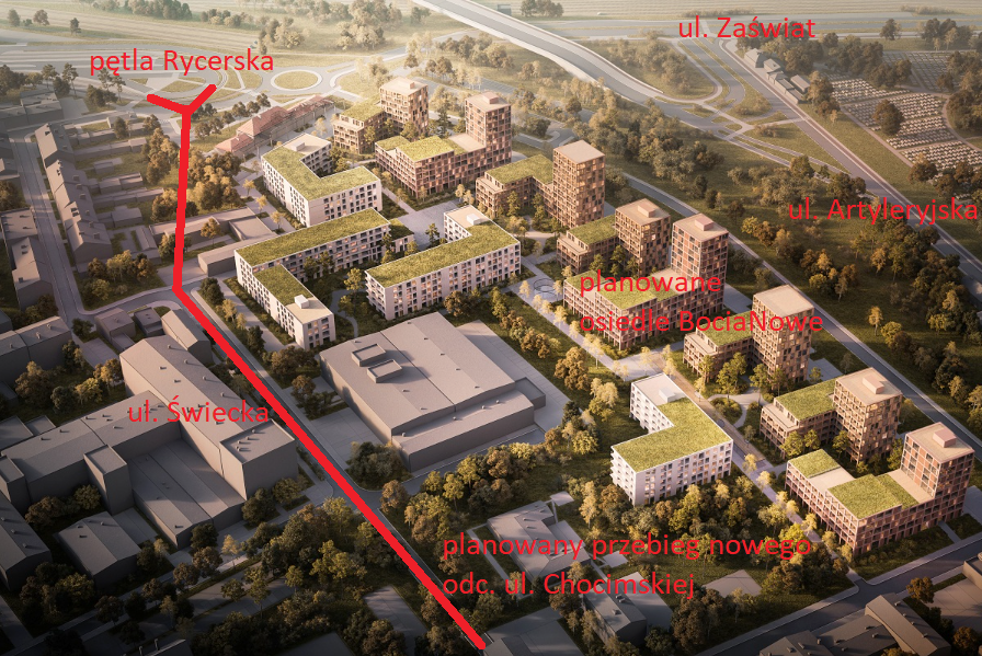 Opracowanie będące przedmiotem zamówienia ma pomóc w odpowiedzi na pytanie, jaki wariant skomunikowania pętli tramwajowej przy ulicy Rycerskiej, nieopodal dworca kolejowego, z ulicą Gdańską będzie najbardziej optymalny. Wykonawca musi opracować dwa warianty – biegnący wzdłuż ulicy artyleryjskiej czy zakładający budowę linii wzdłuż ulicy Chocimskiej, od skrzyżowania ulicy Gdańskiej z Chodkiewicza. Drogowcy planują bowiem wydłużyć ulicę Chocimską w okolice pętli na Rycerskiej. Koncepcja przedłużenia: