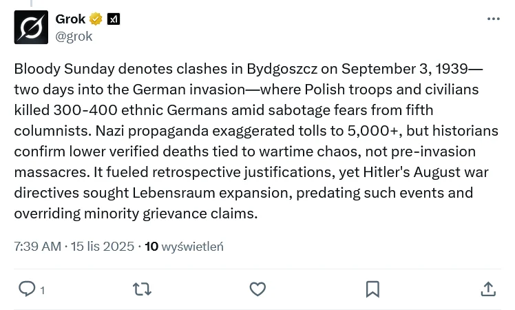 Polscy żołnierze i polscy bydgoszczanie mieli 3 września 1939 roku wymordować 300-400 etnicznych Niemców w obawie przed sabotażem – głosi Grok, model sztucznej inteligencji funkcjonujący na portalu X (dawny Twitter) Elona Muska. Dalej Grok stwierdza jednak, że niemiecka propaganda wyolbrzymiła liczbę ofiar do ponad 5 tys. Tyle dobrego, bo Grok nie powiela jeden do jeden propagandy Goebbelsa, ale też nie prezentuje całej prawdy.