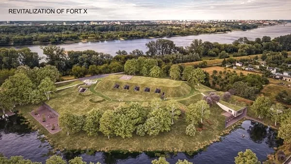 – Ideą projektu domu jest jego “wpisanie się” w założenie fortyfikacyjne w sposób, aby z jego centralnej części kubatura była niewidoczna. Dom zlokalizowano w najniższej części założenia – przy fosie. Zbliżenie domu do fosy pozwoliło wygenerować duży taras, na którym zależało inwestorowi. Dom jest dwukondygnacyjny – strefa dzienna jest zlokalizowana na kondygnacji wyżej. Strefa prywatna wraz zapleczem technicznym znajduje w strukturze terenu. Dach budynku tak jak cały fort, porasta zieleń i trawa. Na podeście oraz elewacji frontowej zastosowano deskę tarasową. Jeżeli chodzi o założenie forteczne to zachowujemy i odtwarzamy jego historyczny kształt. Odtworzeniu będą podlegać zniwelowane elementy ziemne jak m.in. trawersy. Odrestaurowana zostanie także fosa. – wyjaśnia architekt Przemek Gawęda.