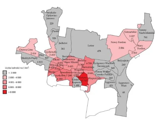 Jeżeli chodzi o gęstość zaludnienia najbardziej zaludnione dzielnice to Wyżyny – 10,8 tys. osób na km2 oraz Błonie – ponad 7,7 tys. osób na km2. Najmniejszy wskaźnik gęstości zaludnienia notujemy na osiedlu Łęgnowo-Wieś – 68 osób na km2.