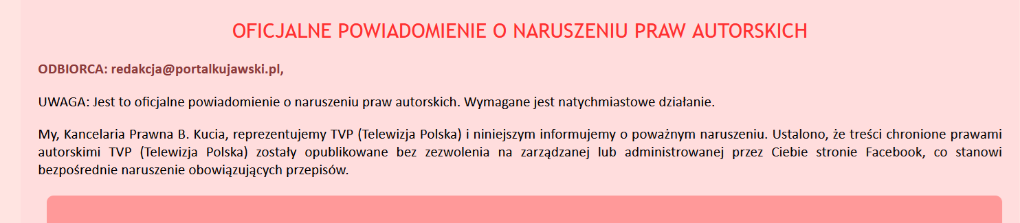 W momencie gdy odbywała się dyskusja o współpracy cywilno-wojskowej w NATO w dziedzinie cyberbezpieczeństwa na maila Portalu Kujawskiego wpłynął mail podszywający się pod kancelarię prawną, iż rzekomo naruszyliśmy prawa autorskie Telewizji Polskiej publikując ich własność intelektualną na Facebook-u. Ten mail został napisany bardzo nieudolnie, fragmentu z języka litewskiego nawet nie przetłumaczono na polski. Najprawdopodobniej za tym phishingiem stoją przestępcy z innego kraju. Była to próba oszustwa na phishing, który jak wynika z raportu CERT za 2024 rok, który został w Bydgoszczy premierowo zaprezentowany w czwartek, odpowiada za 95% incydentów cyberbezpieczeństwa stwierdzanych przez CERT. Gdybyśmy kliknęli na link (pod którym rzekomo są dowody na naruszenie praw autorskich) przestępcy mogliby przejąć kontrole nad naszym kontem na Facebook-u – jeżeli ktoś ma podpięte pod ten serwis karty kredytowe, może stracić pieniądze. Bardziej przebiegli oszuści mogą tworzyć bardziej realistyczne treści.
