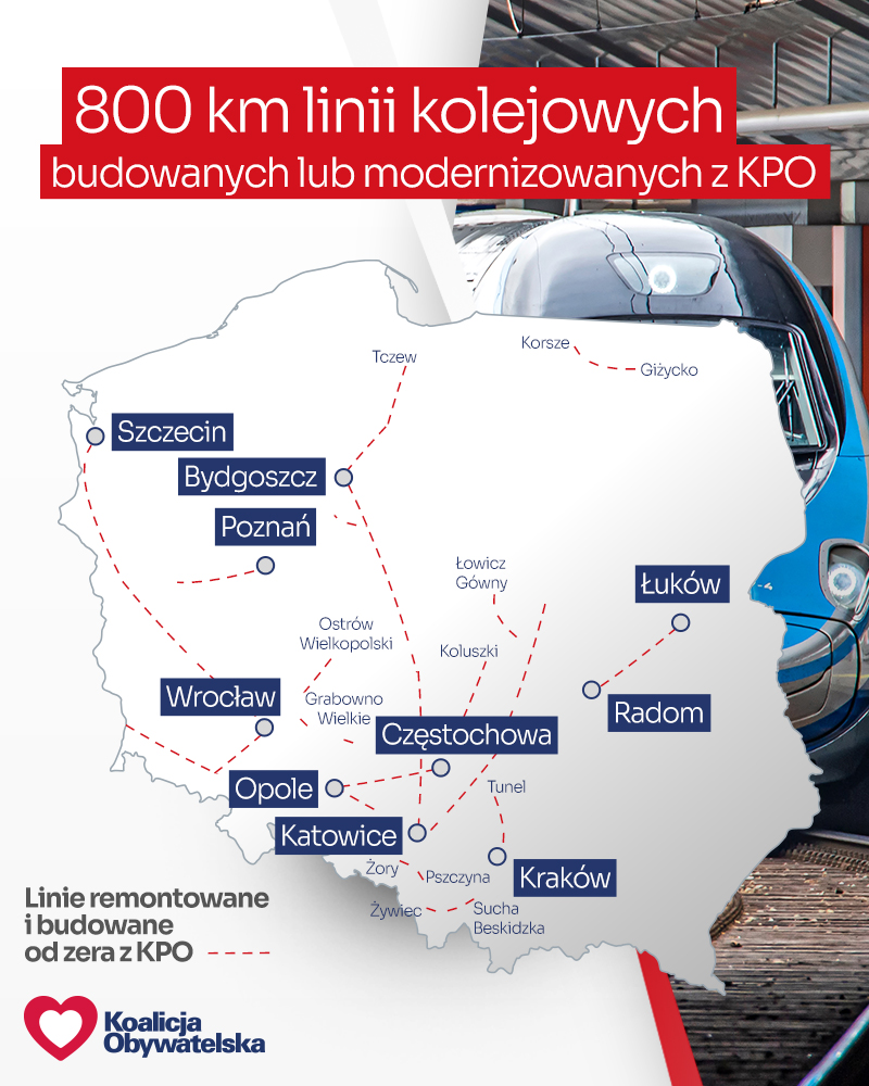 W mediach społecznościowych na profilu Krajowego Programu Odbudowy pojawiła się grafika z mapą inwestycji, na której największym odcinkiem jest ciąg linii nr 131 Tczew-Bydgoszcz-Inowrocław-Katowice: