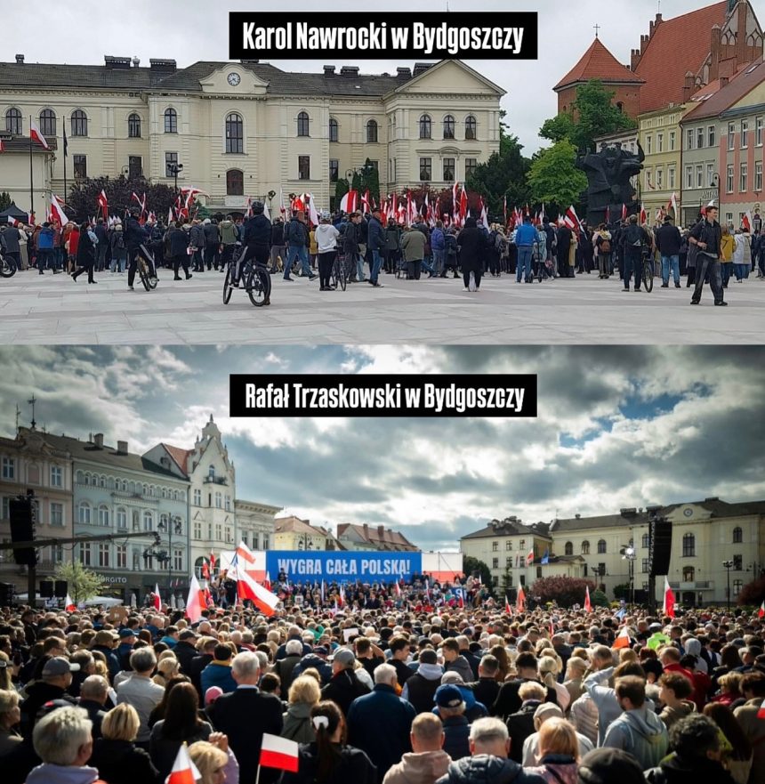 Optycznie faktycznie więc Trzaskowskiego wydaje się liczniejszy, ale dysproporcja nie jest aż tak duża jak mogą sugerować zdjęcia kolportowane przez KO. Trzaskowski gościł w Bydgoszczy w sobotę, gdy Nawrocki w poniedziałek, co mogło mieć też wpływ. Wyniki I tury pokazują też, że akurat Trzaskowski cieszy się w Bydgoszczy znacznie większym poparciem niż Karol Nawrocki. Inna kwestia jest taka, że Sławomir Mentzen na Wyspie Młyńskiej zgromadził jeszcze większą frekwencję, niż obaj wiodący kandydaci, a mimo to do II tury przecież nie wszedł.