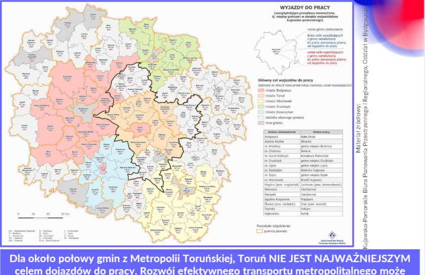 W lutym Departament Planowania Rozwoju i Współpracy Regionalnej Urzędu Marszałkowskiego opublikował wstępną analizę o budowaniu Strategii Metropolii Toruńskiej. Podane wcześniej dane o dojazdach, oparte są właśnie na tym opracowaniu, w którym czytamy dość gorzką ocenę: Dla około połowy gmin z Metropolii Toruńskiej, Toruń NIE JEST NAJWAŻNIEJSZYM celem dojazdów do pracy.