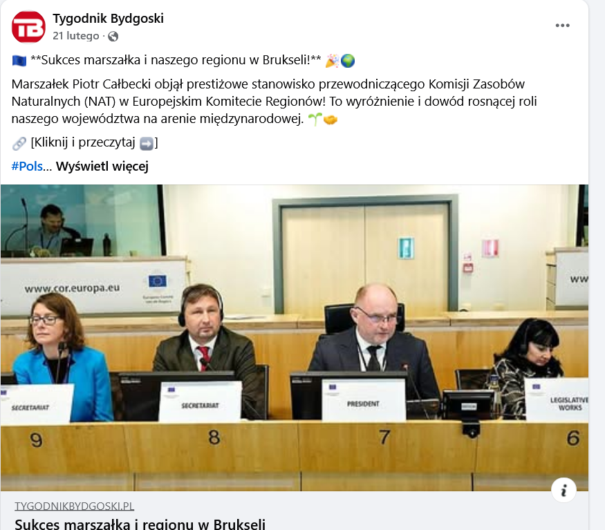 Fundacja Bezpieczny Świat otrzymała za pośrednictwem Urzędu Marszałkowskiego blisko 2 mln zł dofinansowania na prowadzenie Dziennego Domu Pomocy Społecznej w Nowej Wsi Wielkiej, jednocześnie ten podmiot wydaje stronę internetową tygodnikbydgoski.pl, która wręcz spamuje po bydgoskich grupach w socialmediach o sukcesach marszałka Piotra Całbeckiego. Działalność związana z DPS i medialna niby nie jest ze sobą związana, ale nie można wykluczyć występowania konfliktu interesu w kontekście artykułu 10 Europejskiej Konwencji Praw Człowieka.