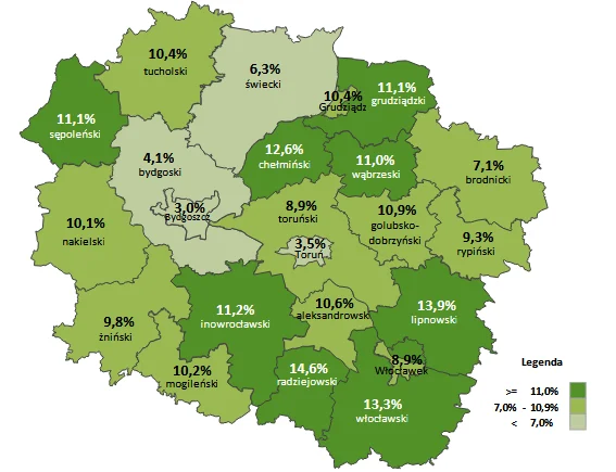 Średnia 7,6% to wypadkowa między bezrobociem w Bydgoszczy, które wynosi tylko 3%, a powiatem radziejowskim gdzie to już prawie 15%. Niepokoić może dość duża liczba powiatów z bezrobociem powyżej 10%. W zachodniej części kujawsko-pomorskiego taka sytuacja ma miejsce w powiatach: sępoleńskim 11,1%, tucholskim 10,4%, nakielskim 10,1%, mogileńskim 10,2% i inowrocławskim 11,2% – gdzie ten problem jest zauważany najbardziej.