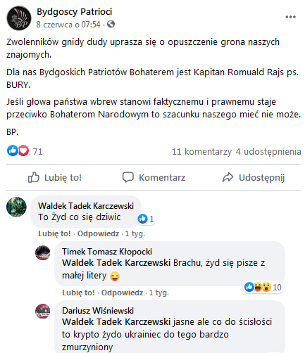 Widać powyżej jak prezes stowarzyszenia Bydgoscy Patrioci poucza, że ,,żyd” pisze się z małej litery.