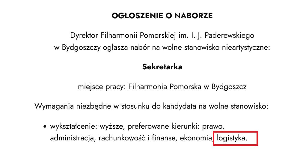 Ogłoszenie o nabór na stanowisko sekretarki Filharmonia Pomorska opublikowała 28 marca, termin składania aplikacji wyznaczono na 15 kwietnia. Gdy na kilka dni przed tym terminem zaczęły docierać do mnie informacje, że to stanowisko obejmie radna mogło wywołać to zaskoczenie, bowiem na ten dzień nie wiadomo było nawet ilu będzie kandydatów. Analizując ogłoszenie natrafiamy na dość zaskakujący wymóg formalny – wykształcenie: wyższe, preferowane kierunki: prawo, administracja, rachunkowość i finanse, ekonomia, logistyka. O ile kwestia preferowania kierunków prawa, administracji, rachunkowości itp. nie jest niczym zaskakującym, to pojawienie się logistyki jest dość zagadkowe, bowiem ta dziedzina mocno odbiega od specyfiki stanowiska. Skoro preferuje się logistyków, to dlaczego nie np. marketingowców?