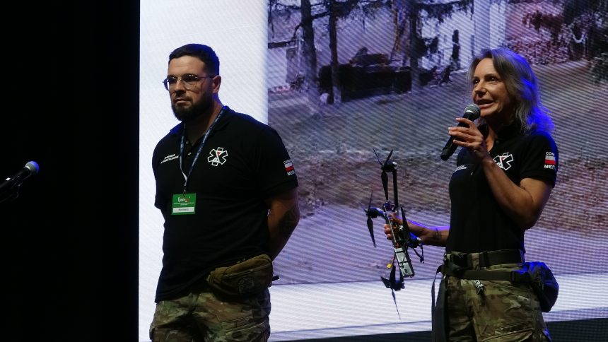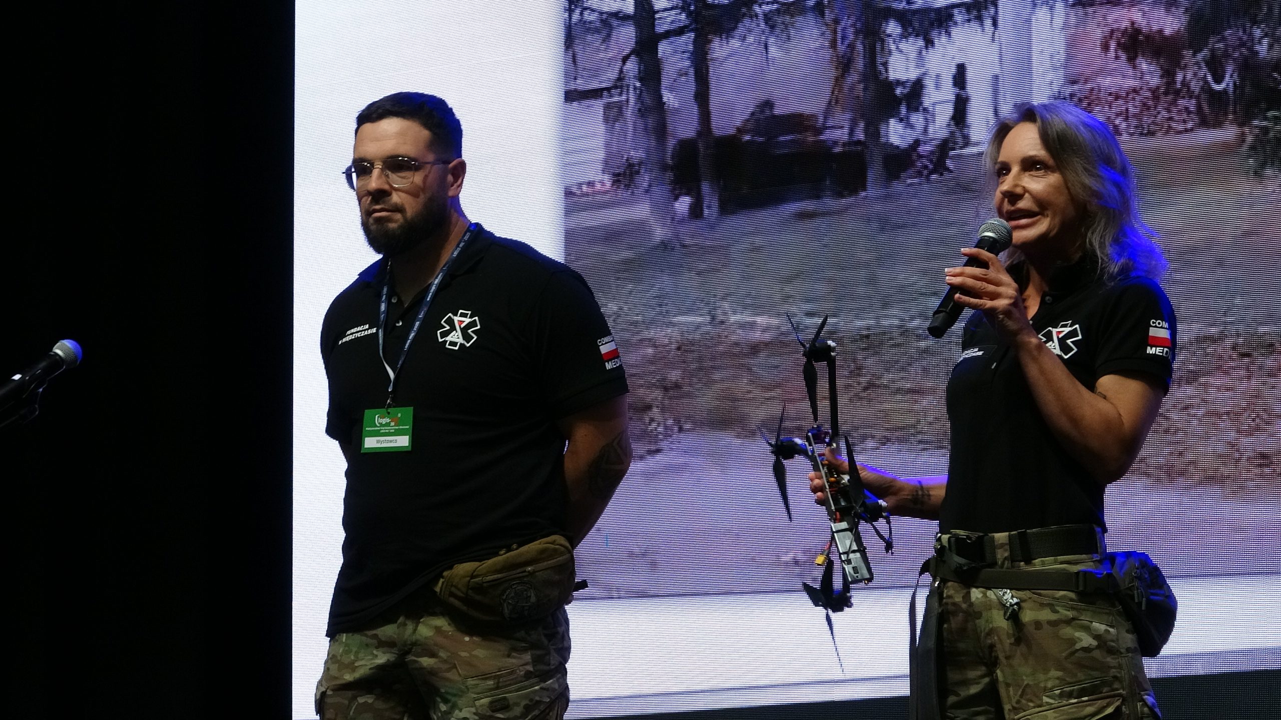 – To jest dron, który miał zabić naszych medyków. To jest dron, który Rosjanie wysłali po to, aby zniszczyć ich ziemiankę i pozbawić ich życia – mówiła we wtorek na scenie targów Logis-Mil Justyna Gotowicz, występująca jako przedstawicielka Fundacji w Międzyczasie. Następnie przekazano tego drona przyjaciołom fundacji, którzy w zamiana przekazali nowoczesny dron z termowizją, który ma wesprzeć polskich medyków na Ukrainie – Dzięki uprzejmości naszych fundatorów, a w tej chwili mogę powiedzieć, że przyjaciół, bo ilość pomocy jaką otrzymaliśmy od DrevaGroup bezcenna. Wcześniej było to auto, które mimo tego, że było postrzelone wróciło do Bydgoszczy i zostało naprawione. I wróciło na front. Dziś wymieniliśmy drony – mówi w rozmowie z nami Gotowicz – Wymieniliśmy ten rosyjski dron na pełnowartościowy dron z terminowizją.