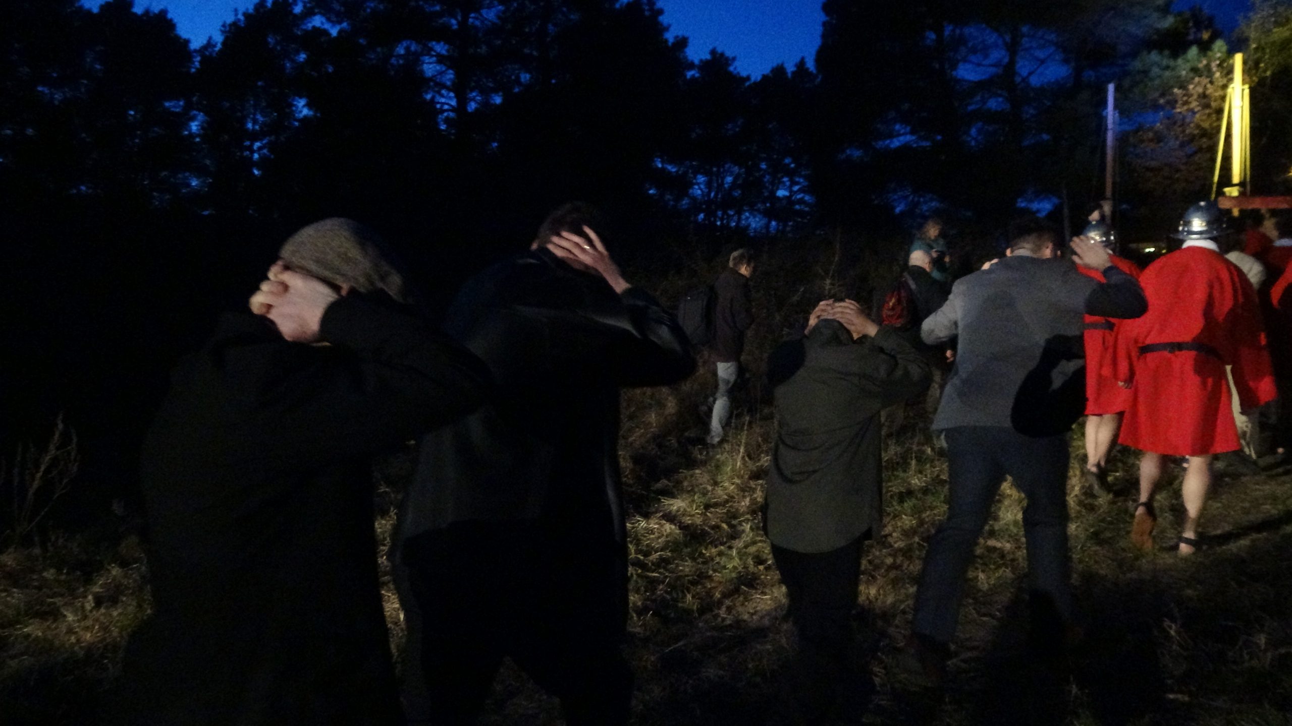 Widok bydgoskiej inteligencji idącej ze skrępowanymi rękoma za Jezusem Chrystusem w jego drodze krzyżowej, pod górę na Golgotę, gdzie dokonać ma się jego ukrzyżowanie, to bardzo szczególna scena, która mogliśmy zobaczyć podczas XXIV. Misterium Męki Pańskiej w Fordońskiej Dolinie Śmierci.