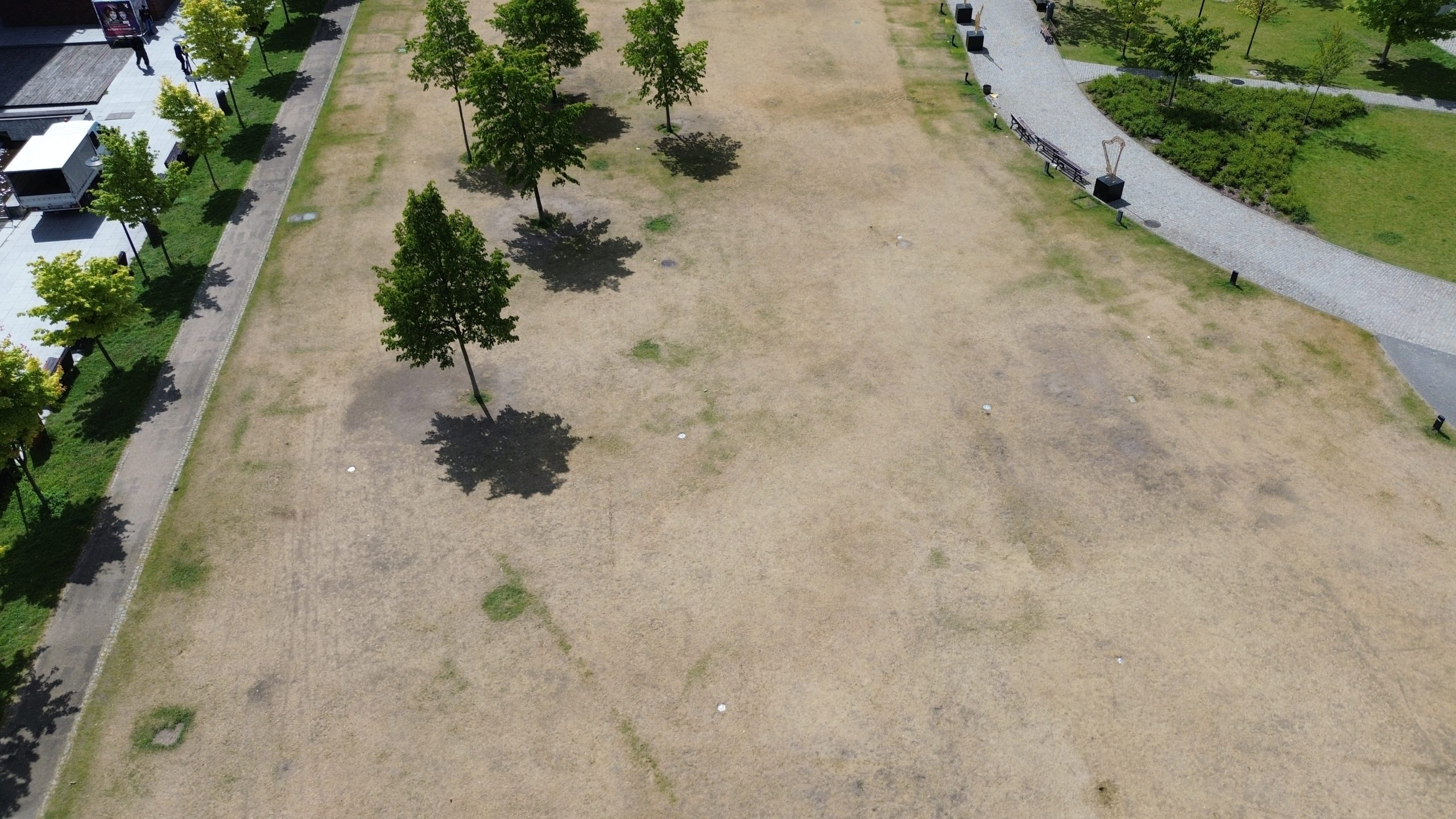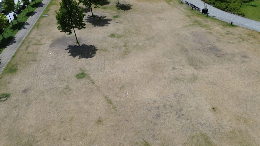 Patrząc z perspektywa niemal cała przestrzeń centralnego trawnika na Wyspie Młyńskiej nie wygląda jak trawnik. Zrobił się on żółty i wyschnięty, wyglądający niezbyt zdrowo. Są też fragmenty, gdzie widoczne są nawet większe ubytki. Ratusz wyraża spokój zakładając, że za kilka dni powinniśmy odczuć pozytywny efekt.