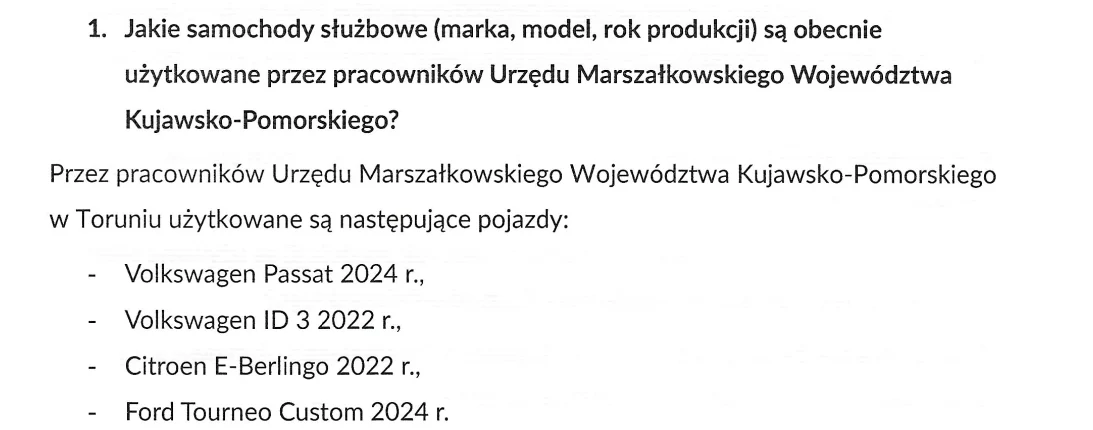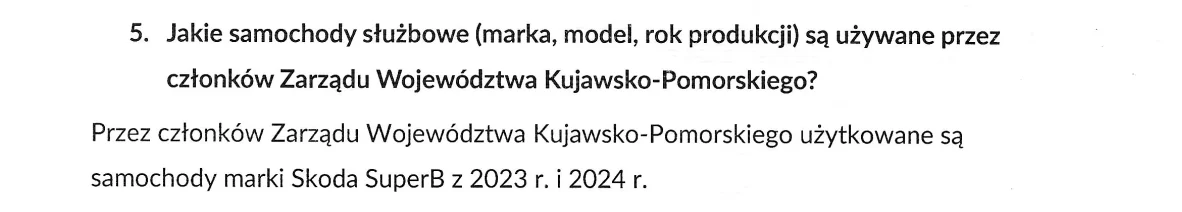 We wcześniejszym pytaniu radny zapytał o całą flotę z jakiej korzysta Urząd Marszałkowski. Tutaj nie tylko nie ma Touarega, ale też Skody SuperB, która pojawia się w pytaniu o Zarząd Województwa. Odpowiedź ta wydaje się zatem niespójna logicznie i budzi wątpliwość co do tego, czy jest rzetelna.