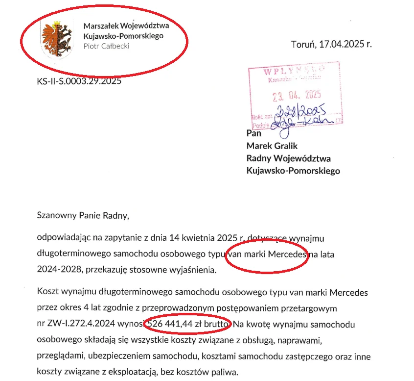 Co więcej w odpowiedzi na interpelacje marszałek (w jego upoważnieniu podpisał się wicemarszałek Zbigniew Ostrowski) na piśmie potwierdza najem 4-letni pojazdu marki Mercedes za 526 tys. do 2028 roku. Zgodnie z tą umową, po zakończeniu tego okresu pojazd zabierze firma najmująca.