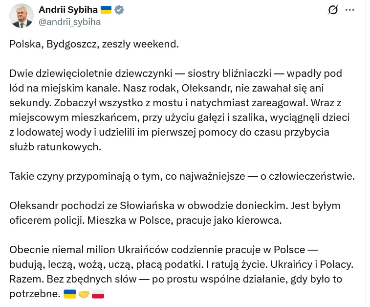 Już w poniedziałek informacje o zdarzeniu w Bydgoszczy pojawiły się na ukraińskich portalach. We wtorek sprawę postanowił też nagłośnić ukraiński ambasador w Polsce Andrii Sybiha – Takie czyny przypominają o tym, co najważniejsze — o człowieczeństwie – napisał na portalu X – Ołeksandr pochodzi ze Słowiańska w obwodzie donieckim. Jest byłym oficerem policji. Mieszka w Polsce, pracuje jako kierowca.