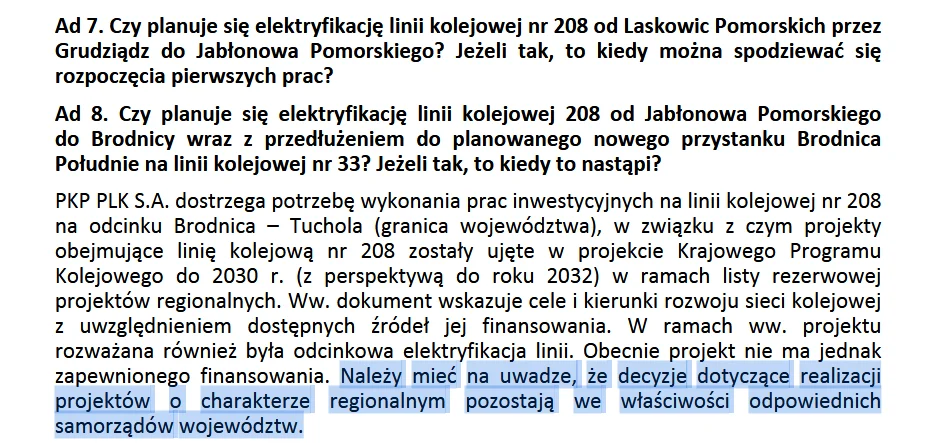Marszałek radnemu Czepkowi odpowiadał, że jest to ważna linia i że na pewno będą toczone w jej sprawie rozmowy. Dodał również, że na liście rezerwowej Paktu Kolejowego znajduje się elektryfikacja linii nr 207 z Torunia przez Grudziądz do Malborka. Czytając ten dokument literalnie można uznać, że dla województwa ważniejsza jest pełna elektryfikacja Grudziądza linią z Torunia niż z Bydgoszczy. Przy czym jest to znacznie dłuższy odcinek i wymaga współpracy z województwem pomorskim, przez co będzie to możliwe w dużo późniejszej perspektywie.