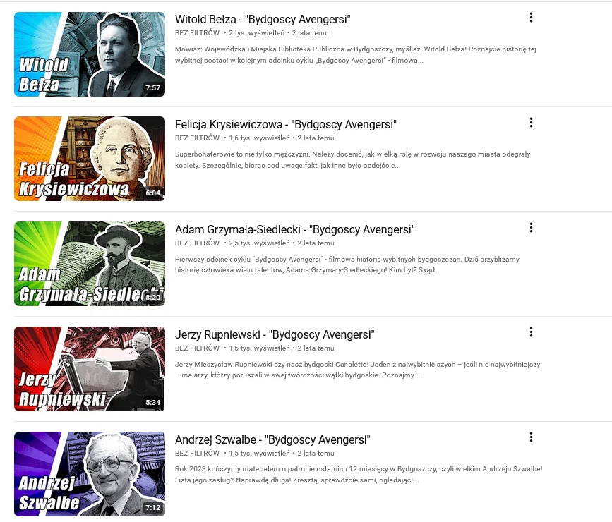 Słyszeliście o bydgoskich Avengersach? – większość czytających może nie kojarzyć, bo pięć filmów z tego cyklu obejrzano łącznie zaledwie 9 tys. razy, przy czym jednostkowo najwyższy wynik to 2,5 tys. wyświetleń (pozostałe nie przekroczyły 2 tys.). Urząd Miasta wydał na ten cykl 15 tys. zł na rzecz Fundacji Krzewienia Kultury i Turystyki Nad Rzeką. Czyli do każdego obejrzenie Bydgoszczanie dopłacają ponad 1,6 zł.