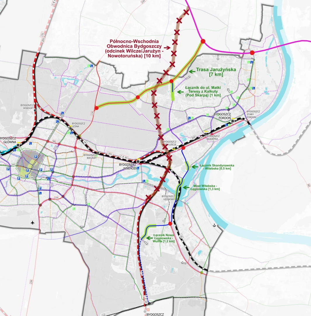 Są to obecnie jedynie wstępne koncepcje, które nie są w żaden sposób usankcjonowane. Zamiast budowy południowo-wschodniej obwodnicy o długości ok. 10 km, na którą w dłuższej perspektywie nie będzie pieniędzy – pojawiają się dwa tańsze projekty. Pierwszy dotyczy skomunikowania Bydgoskiego Parku Przemysłowo-Technologicznego, a drugi budowy alternatywnego ciągu do Fordonu tzw. Trasy Jarużyńskiej.