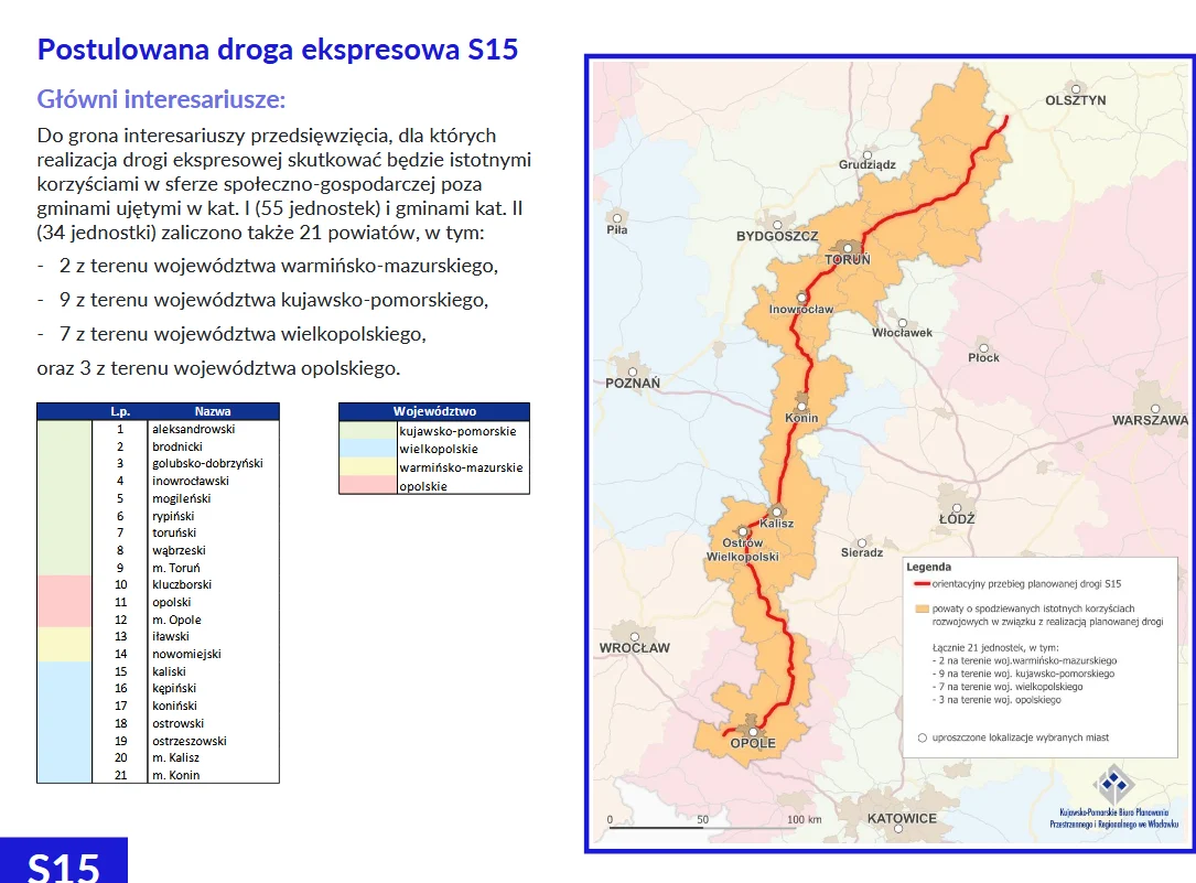 Koncepcja zakłada poprowadzenie S-15 jako połączenia Olsztyna z Toruniem, Inowrocławiem, Koninem (autostrada A2), Kaliszem i Opolem. W praktyce zatem od Olsztyna do Inowrocławia trzymamy się dzisiejszej DK15, a od Inowrocławia na południe DK25 oraz koncepcji Via Pomerani. Poprawa skomunikowania Inowrocławia z Gnieznem pojawia się już tylko jako projekt uzupełniający.